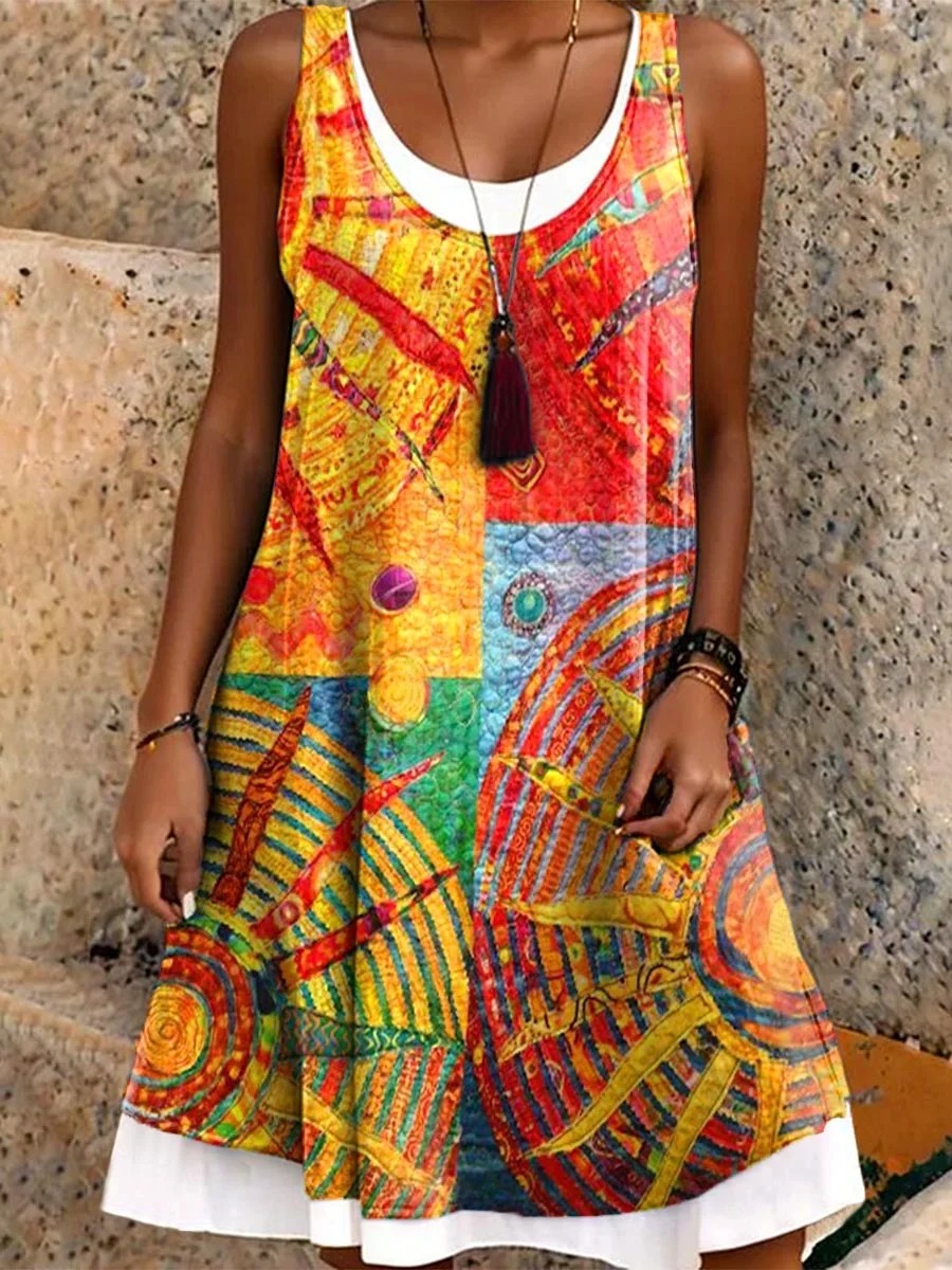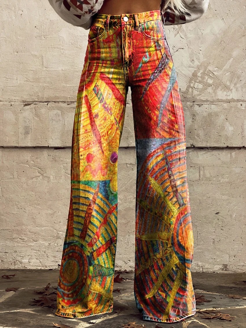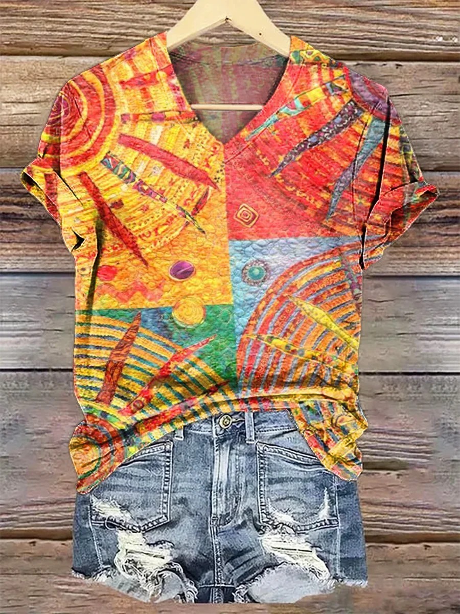 Women's Bohemian Sun Collage Art Pattern Print Casual Cotton Linen Shirt