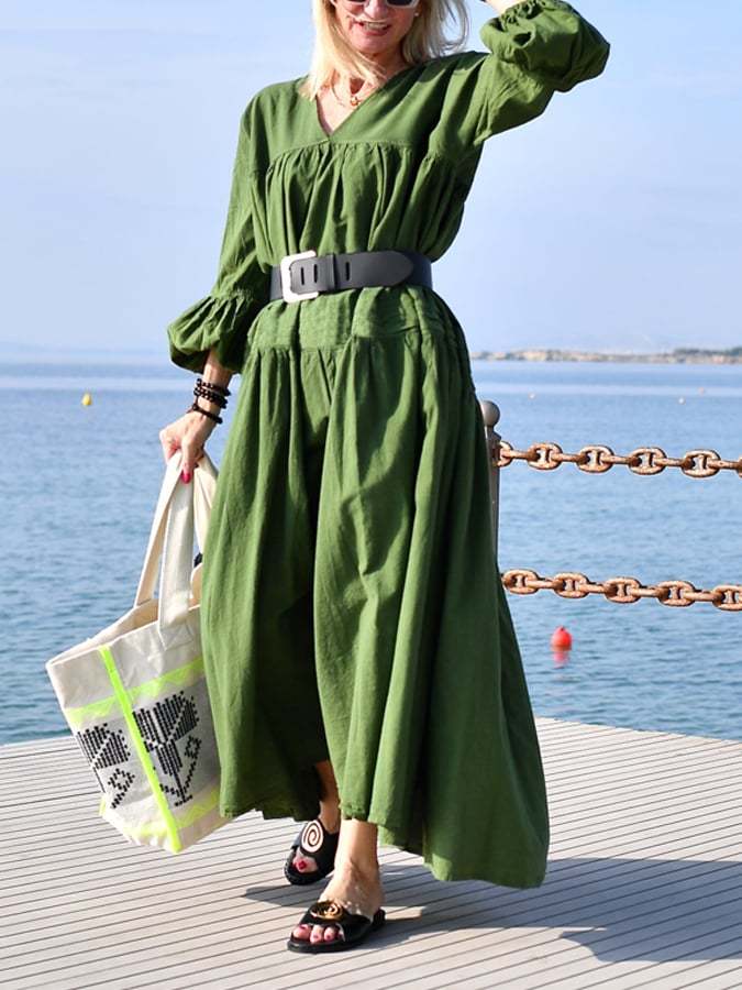 Women's Casual Elegant Pleated V-Neck Cotton Dress