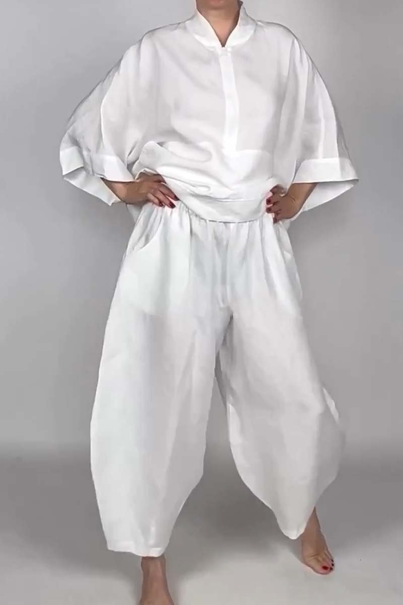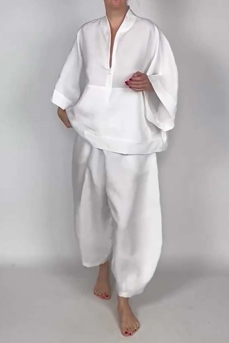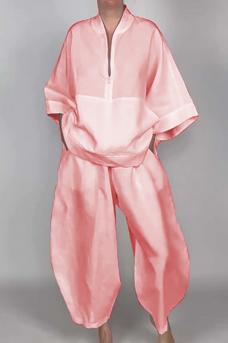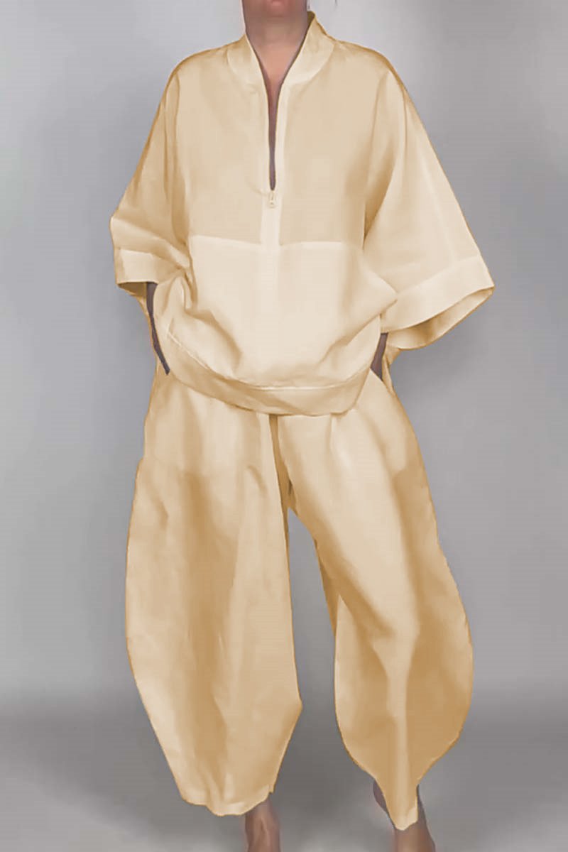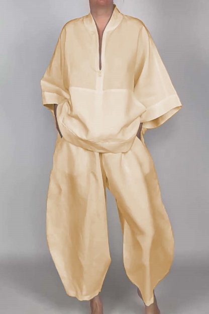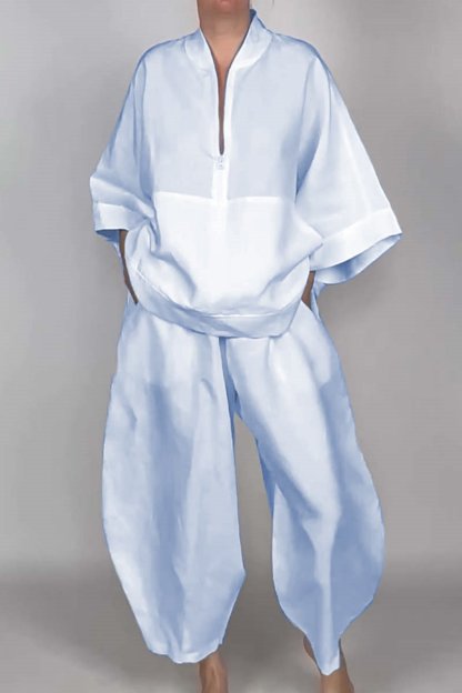 Women's casual half-zip top + bloomers solid color two-piece set