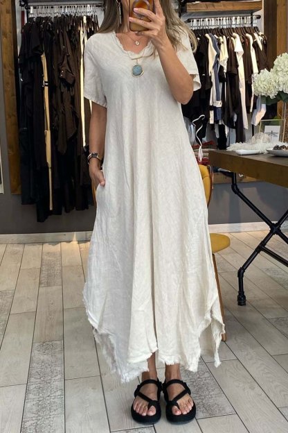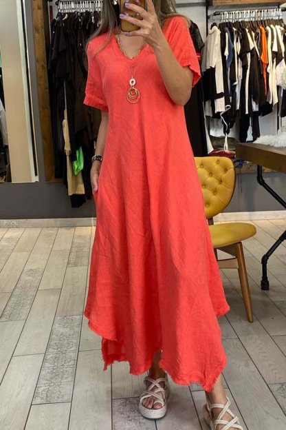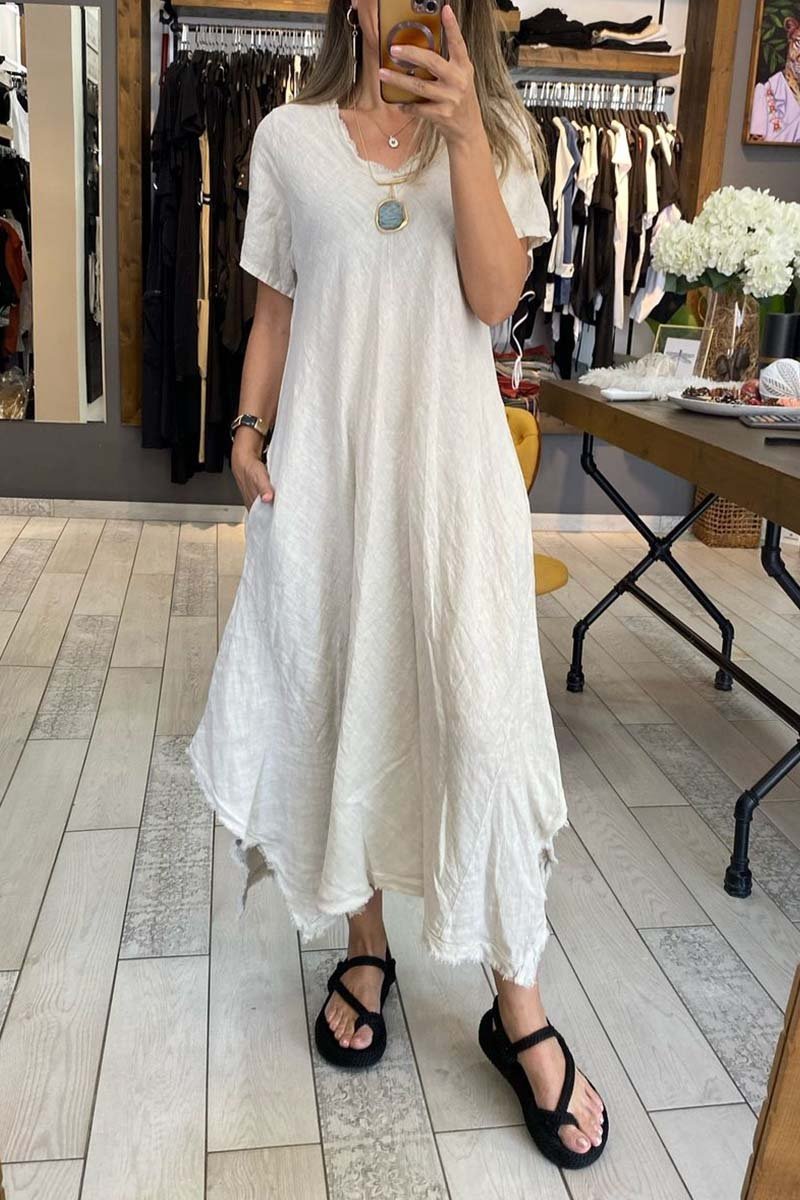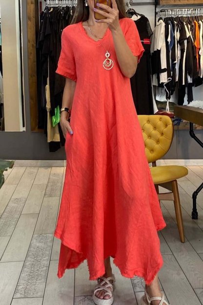 Women's casual V-neck short-sleeved cotton and linen dress