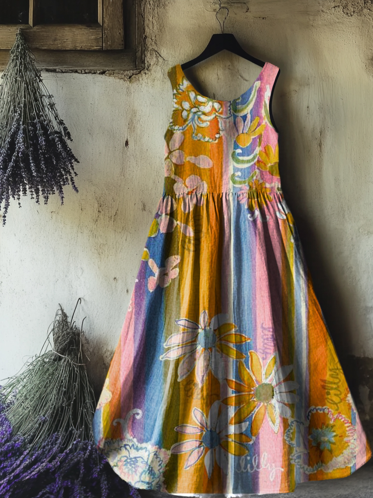Women's Floral Art Print Round Neck Sleeveless Cotton Pocket Dresses