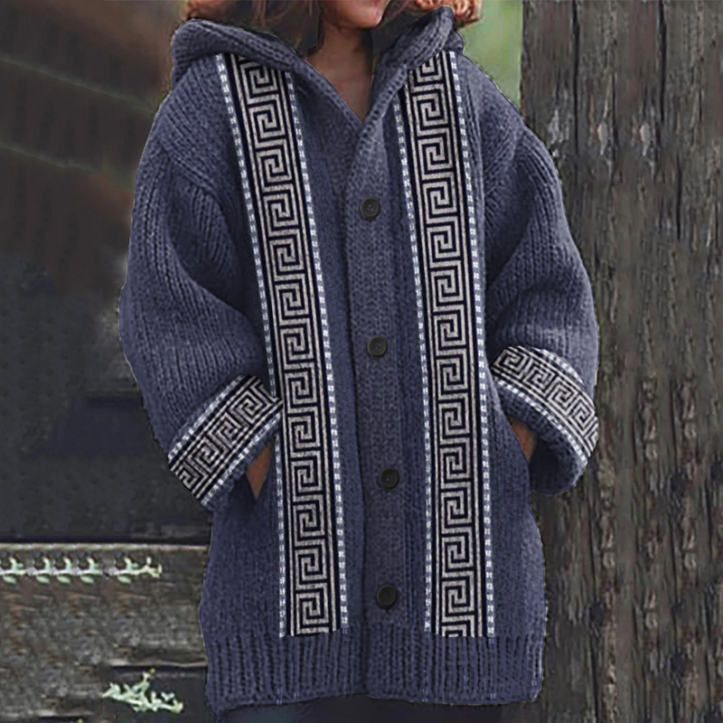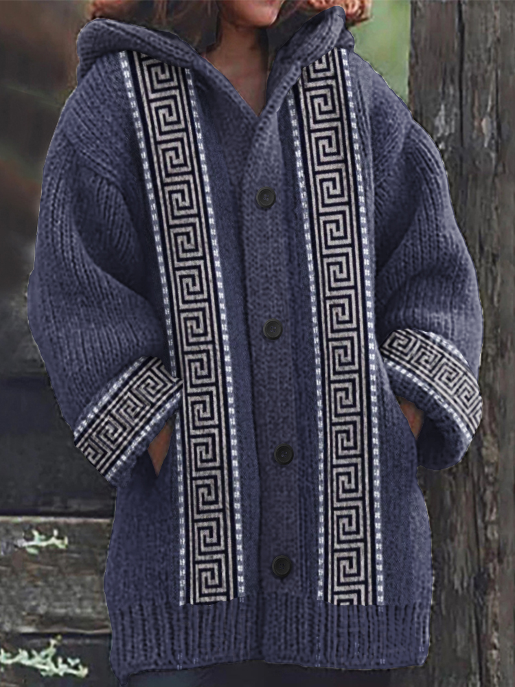 Women's Greek Geometric Jacquard Knit Cozy Hooded Cardigan