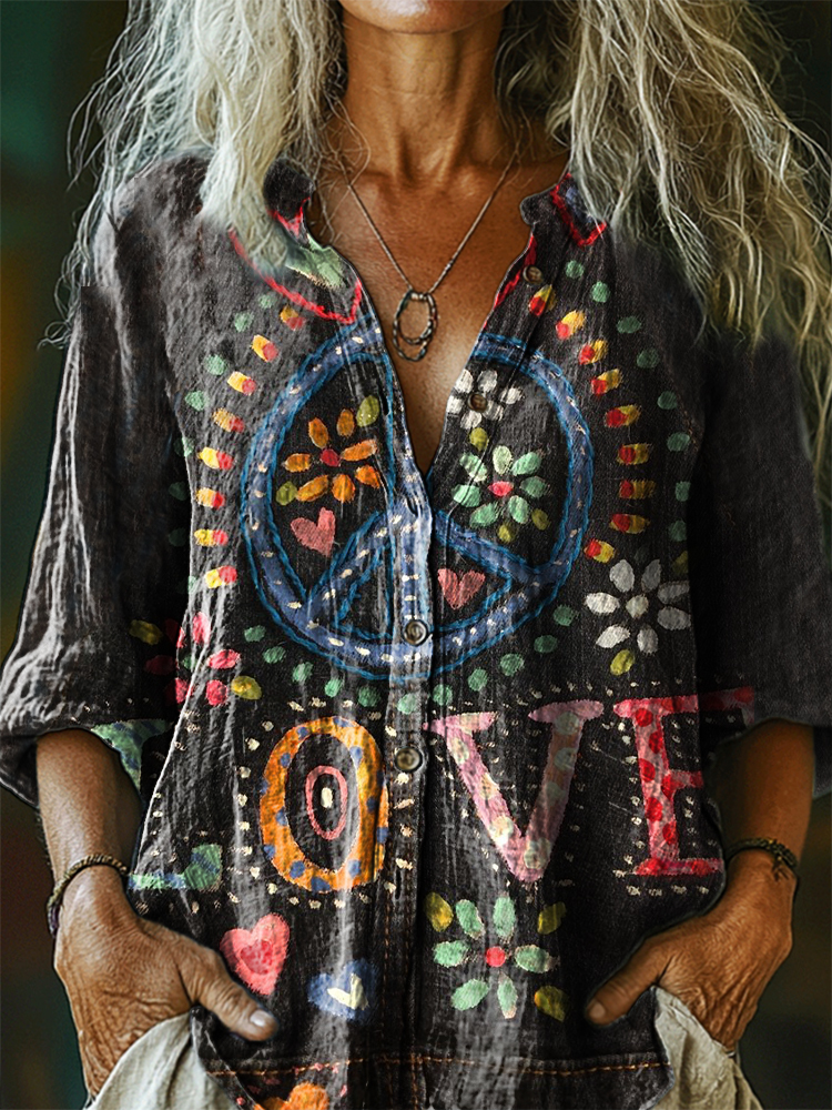 Women's Hippie Love Art Print Casual Cotton Linen Shirt