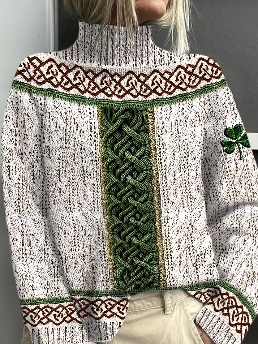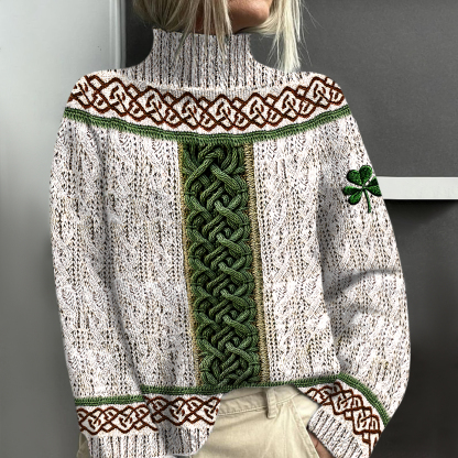 Women's Irish Celtic Knot Shamrock Contrast Jacquard Turtleneck Sweater