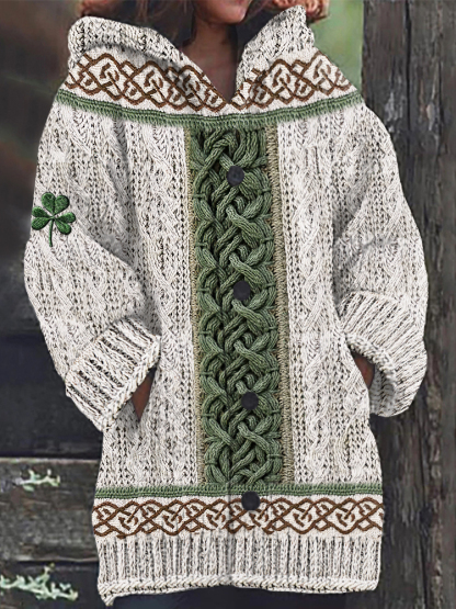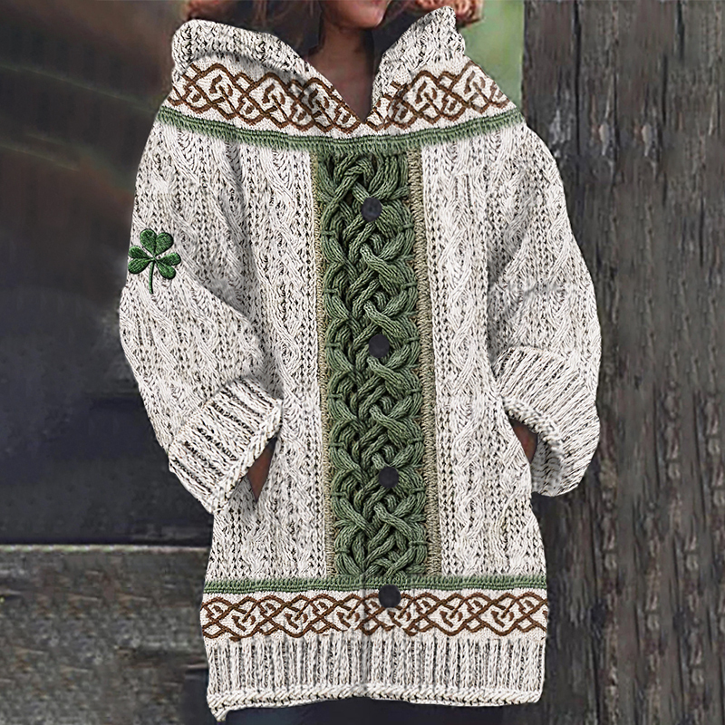 Women's Irish Celtic Knotted Shamrock Contrast Jacquard Sweater Cardigan