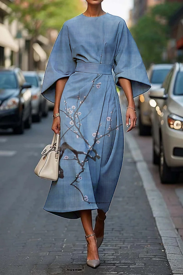 Women's Retro Elegant Japanese Simple Plum Blossom Print Midi Dress