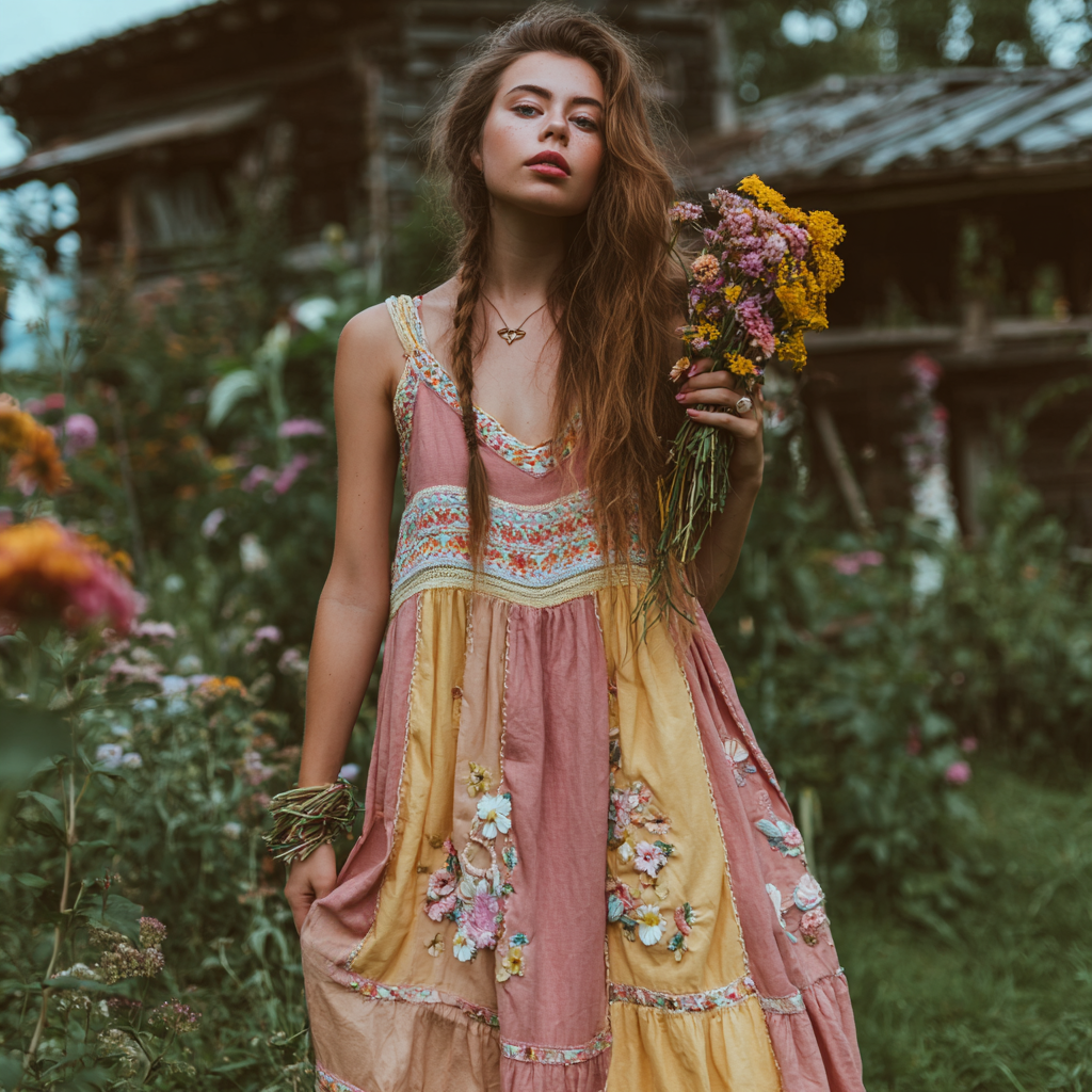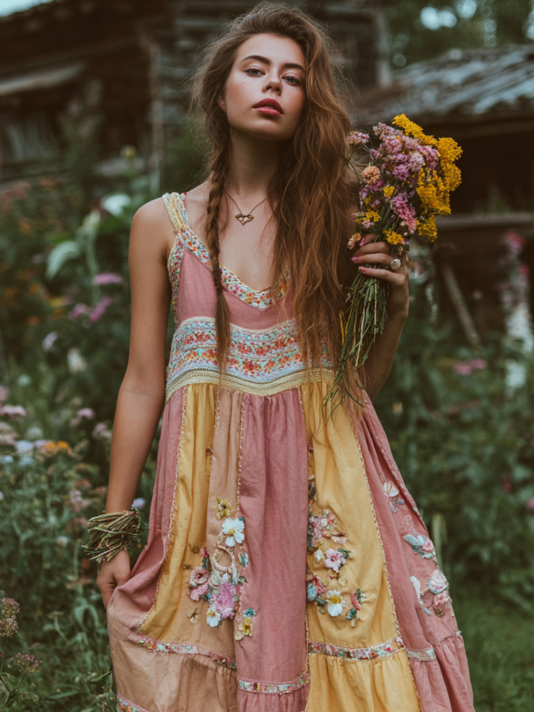 Women's Retro Ethnic Floral Art Stitching V-neck Dress