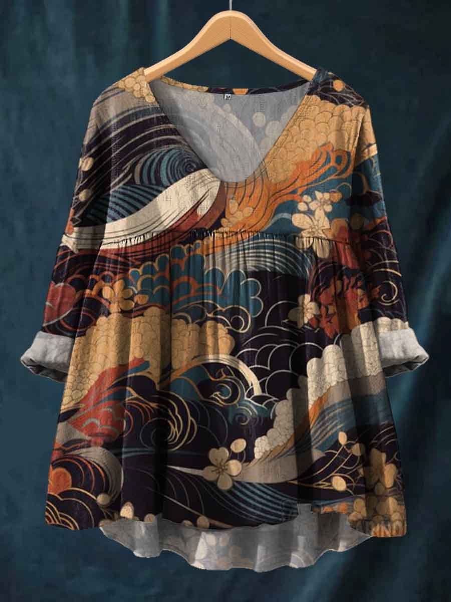 Women's V-neck Ethnic Pattern Printed Pleated Casual Comfort Cotton Shirt