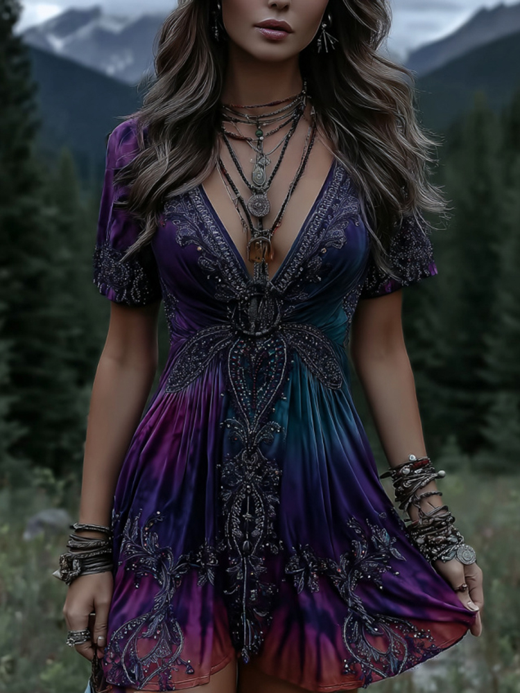 Women's Viking Celtic Gradient Embroidery Art Casual Short Mini Dress