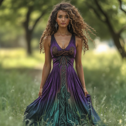 Women's Viking Celtic Knot Gradient Pattern Linen V Neck Maxi Dress