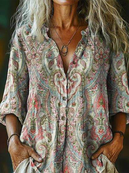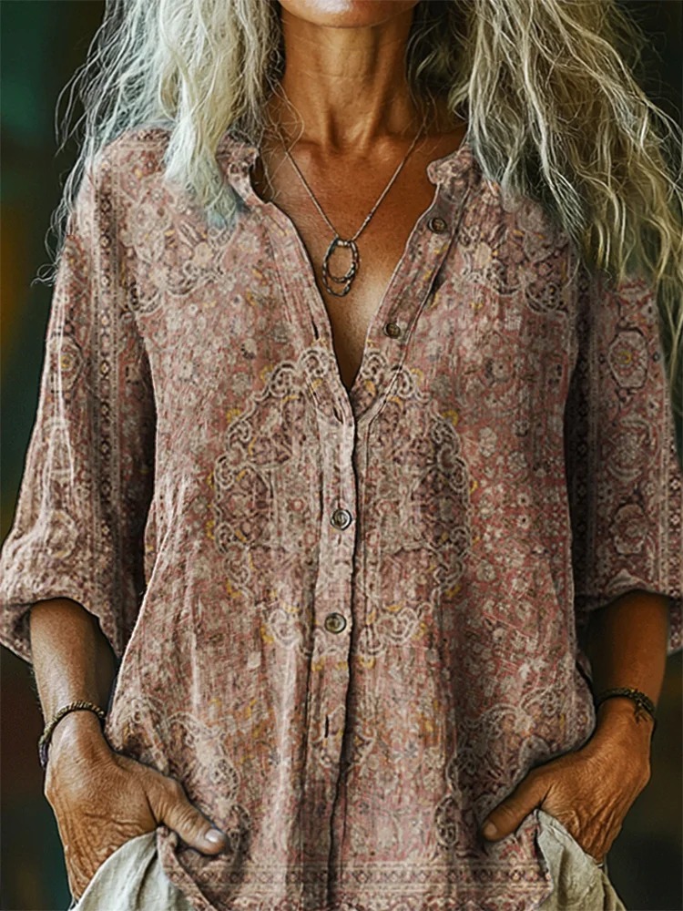 Women's Vintage Ethnic Floral Art Print Linen And Cotton V-neck Casual Shirt