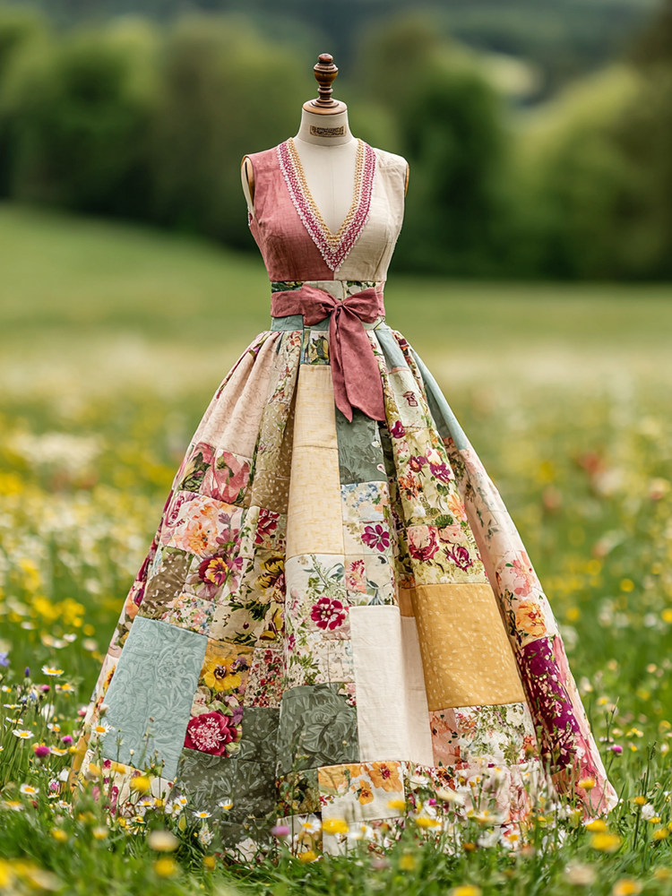 Women's Vintage Floral Patch V Neck Comfy Maxi Dress