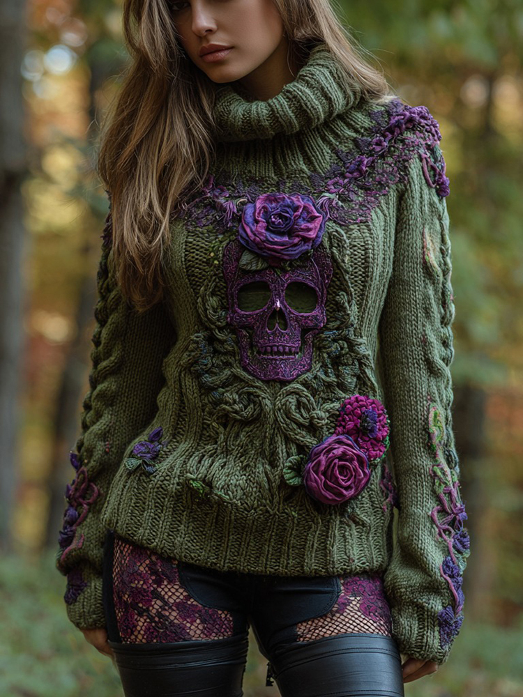 Women's Vintage Sugar Skull And Rose Knitted Jacquard Cozy Warm Turtleneck Sweater