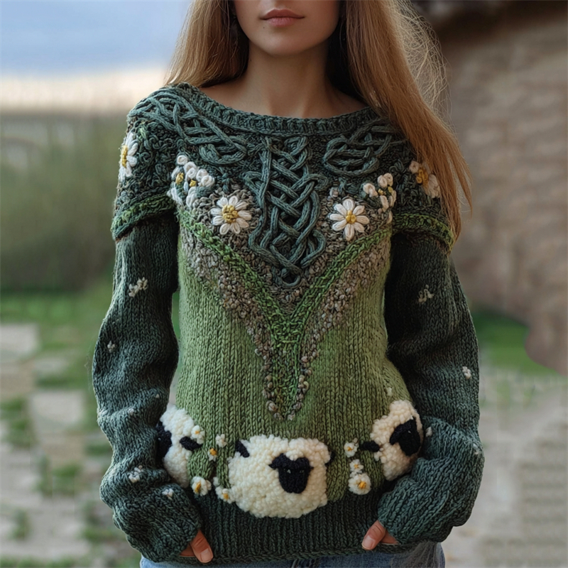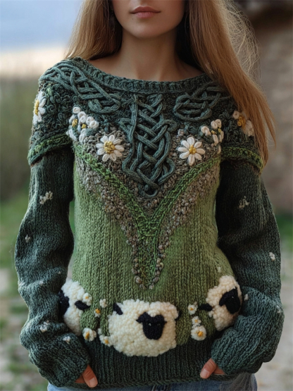 Fuzzy Sheep Floral Vintage Celtic Crochet Cozy Knit Sweater