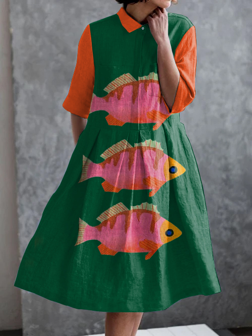 Holiday Ocean Fish Print Casual Pocket Half Sleeve Dress