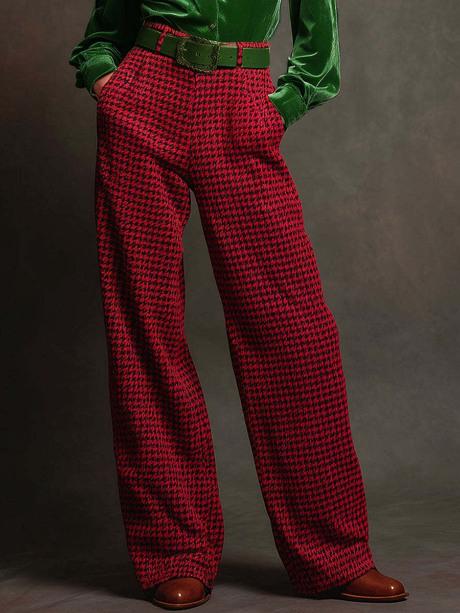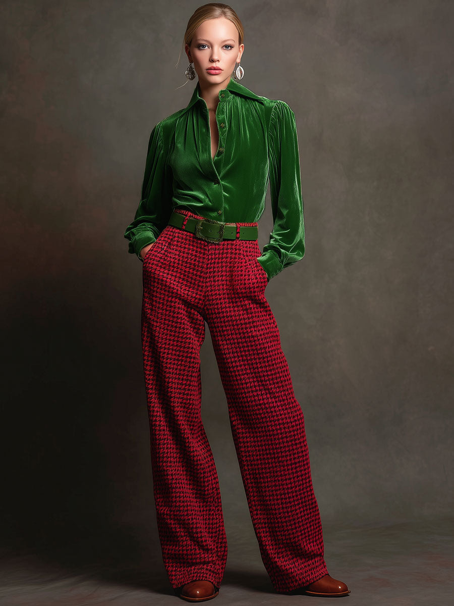 Retro Green Velvet Pleated Long-sleeved Shirt And Houndstooth Wide-leg Pants Set