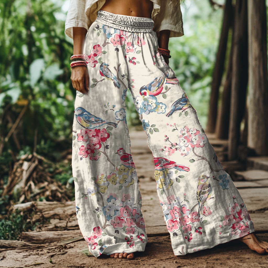 Vintage Floral and Bird Art Print Loose Wide-leg Pants