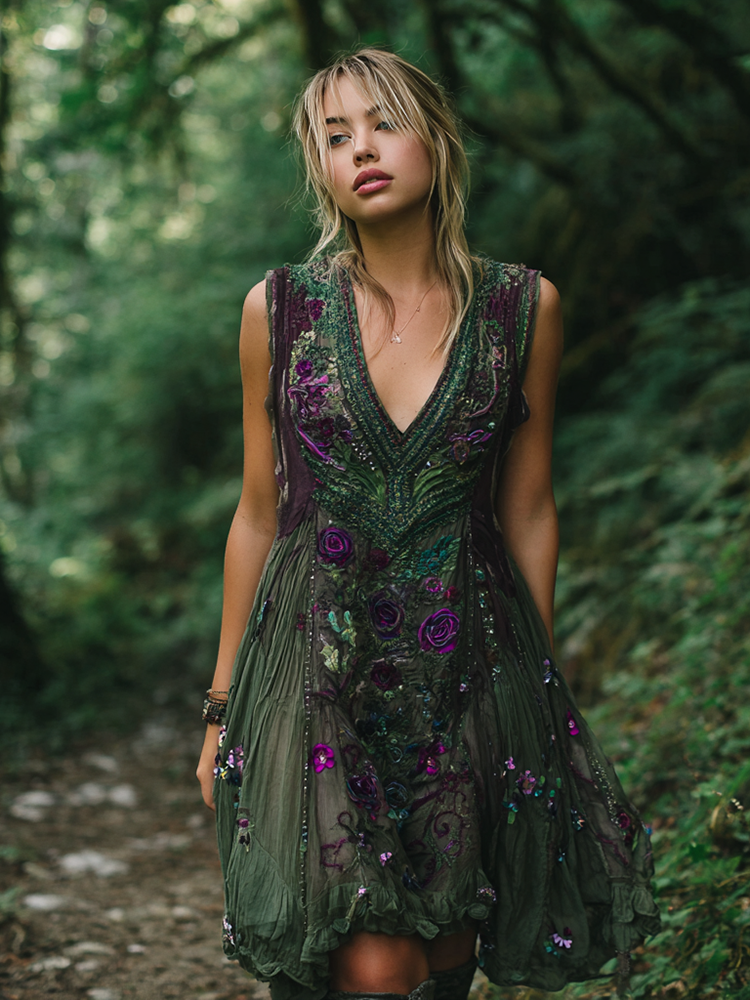 Vintage Purple Rose Embroidery Linen V Neck Sleeveless Dress