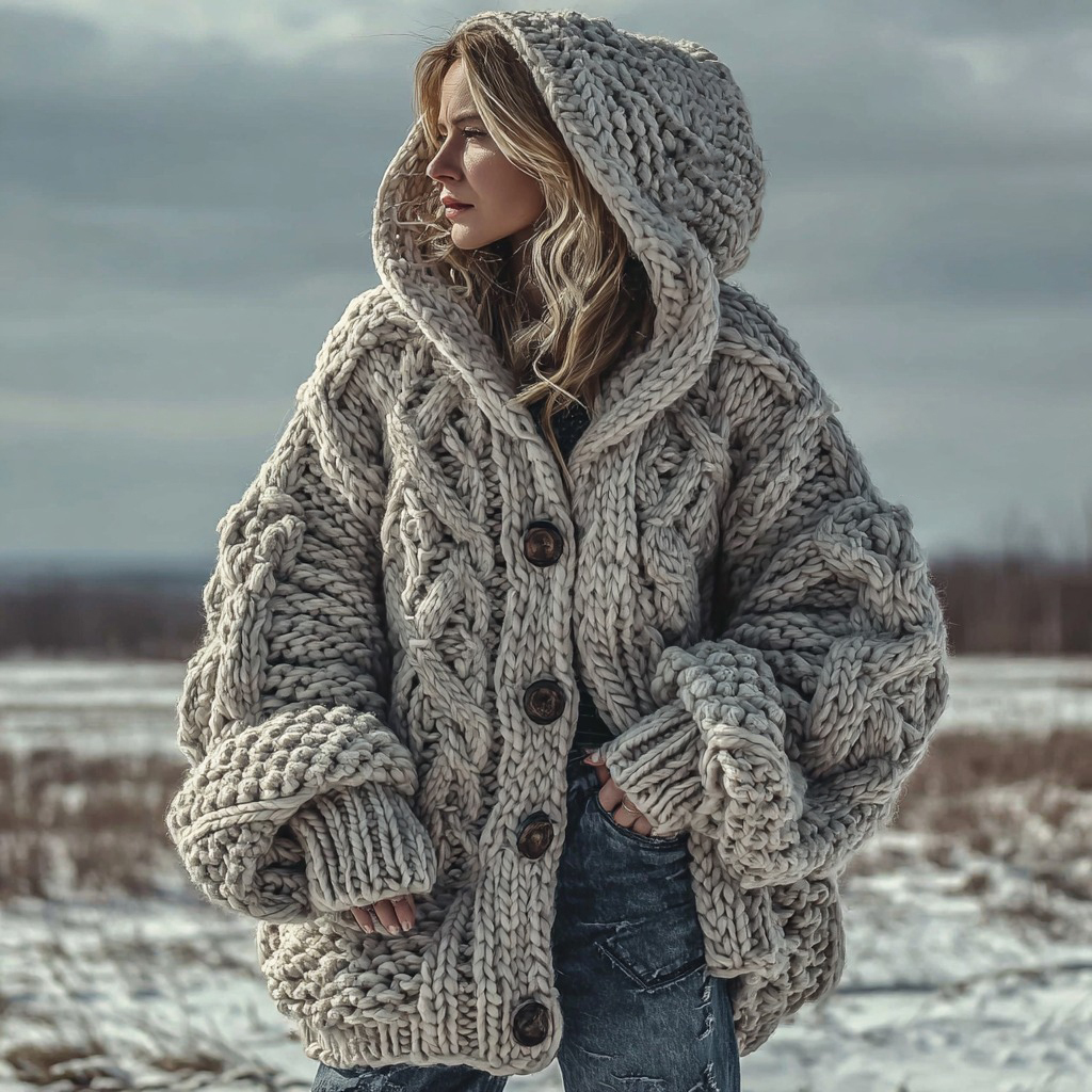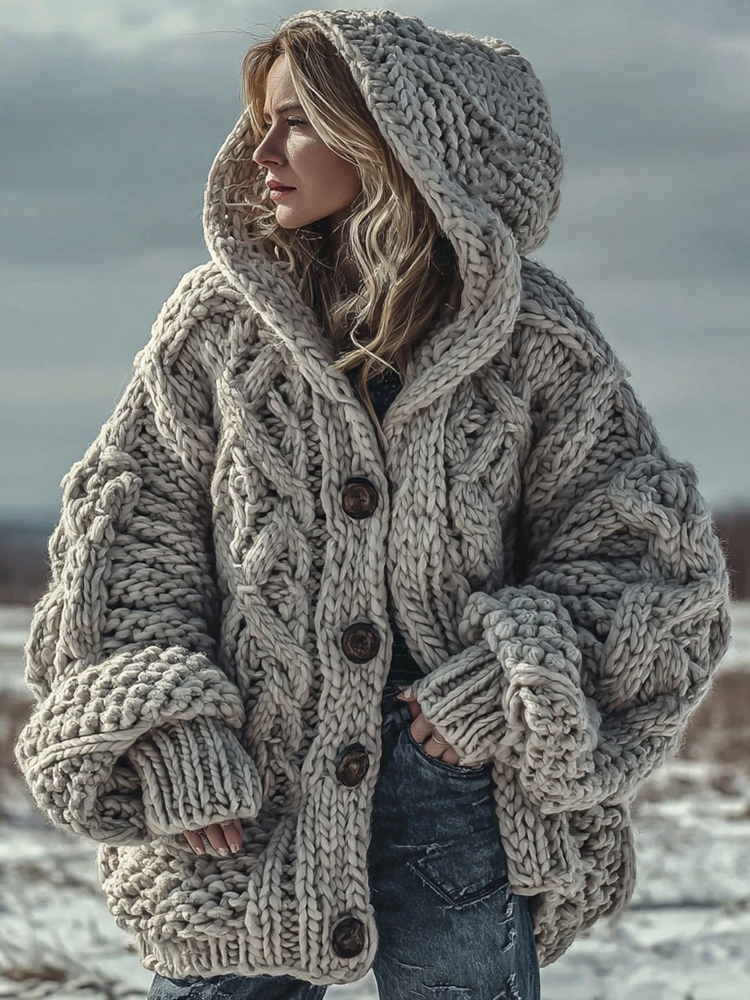 Women's Fair Isle Chunky Knit Warm Button-down Hooded Cardigan