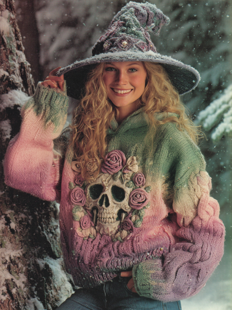 Women's Gradient Rose And Skull Inspired Chunky Knit Hooded Sweater