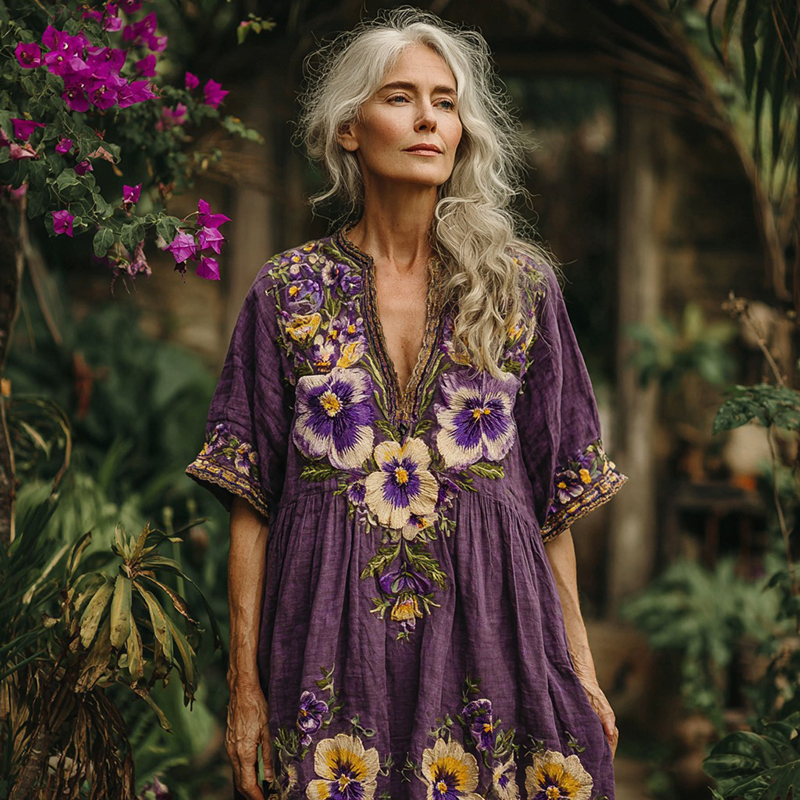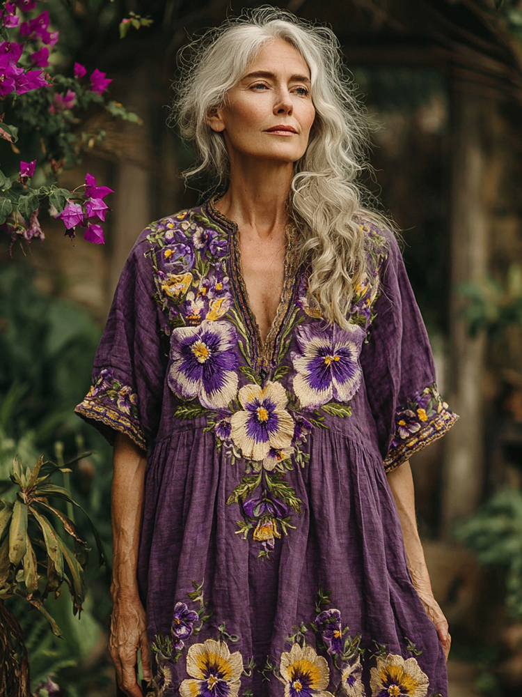 Women's Pansy Embroidery Design Inspired Art Casual V Neck Linen Maxi Dress