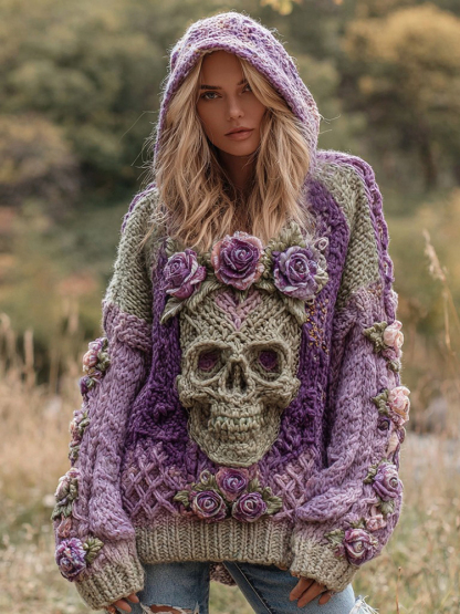 Women's Rose And Skull Inspired Knit Cozy Hooded Sweater