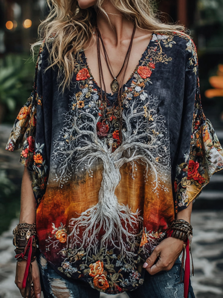Women's Viking Tribal Tree Of Life And Floral Embroiderd In Rainbow Art Casual Shirt
