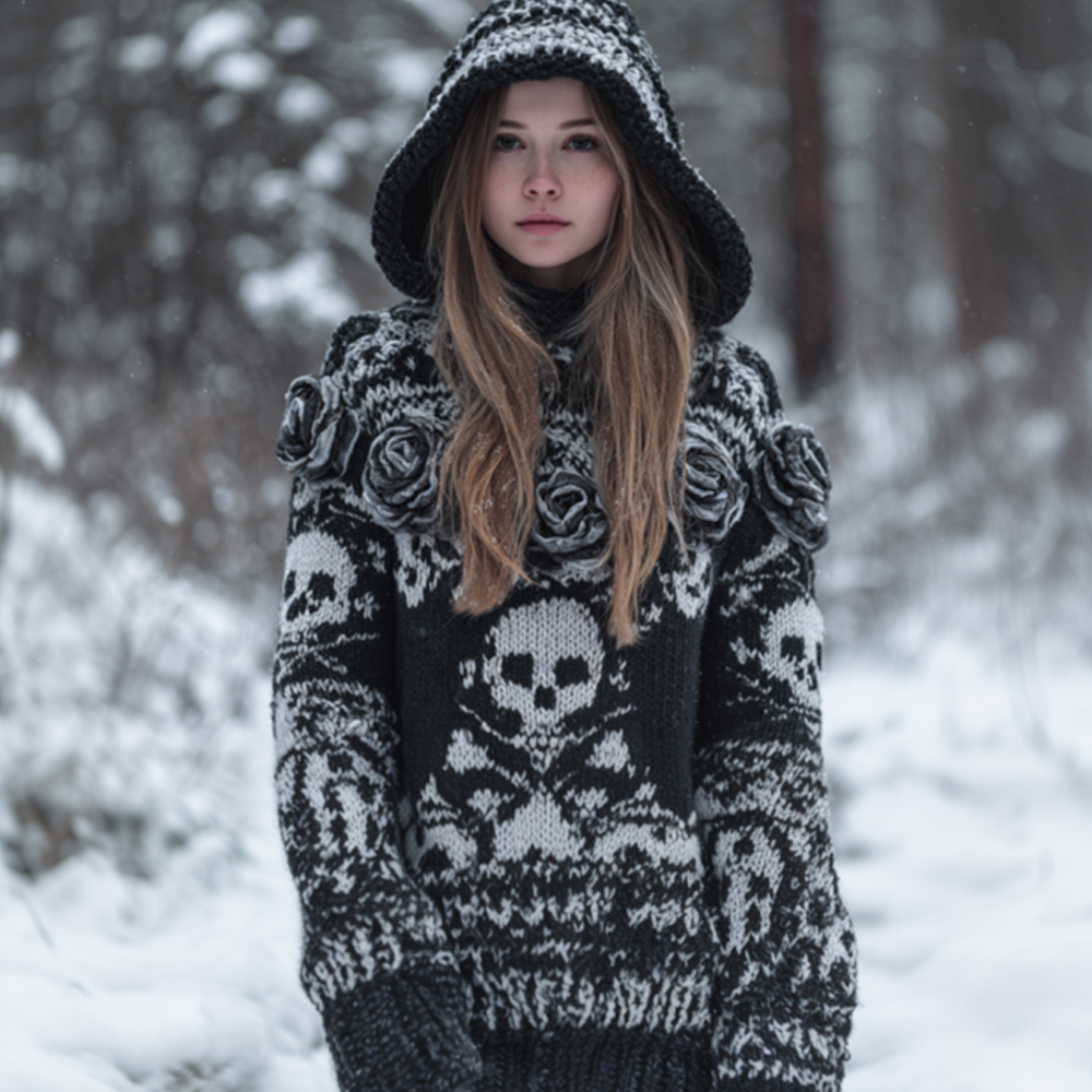 Women's Vintage Skull Black And White Rose Thick Needle Casual Warm Hooded Sweater