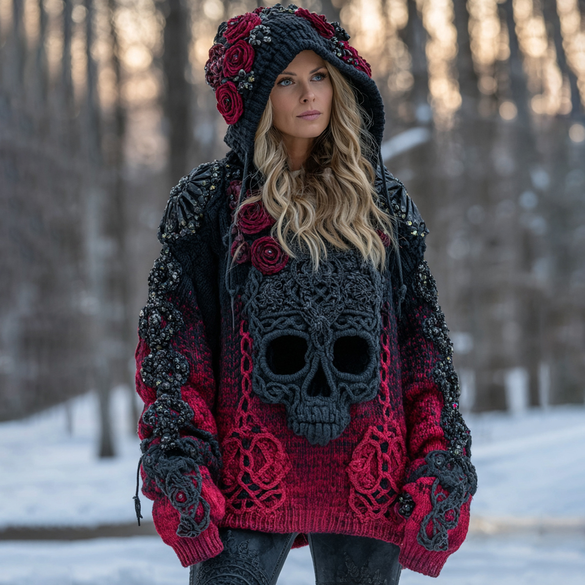 Women's Vintage Skull Flower Gradient Celtic Art Cozy Knitted Hooded Sweater
