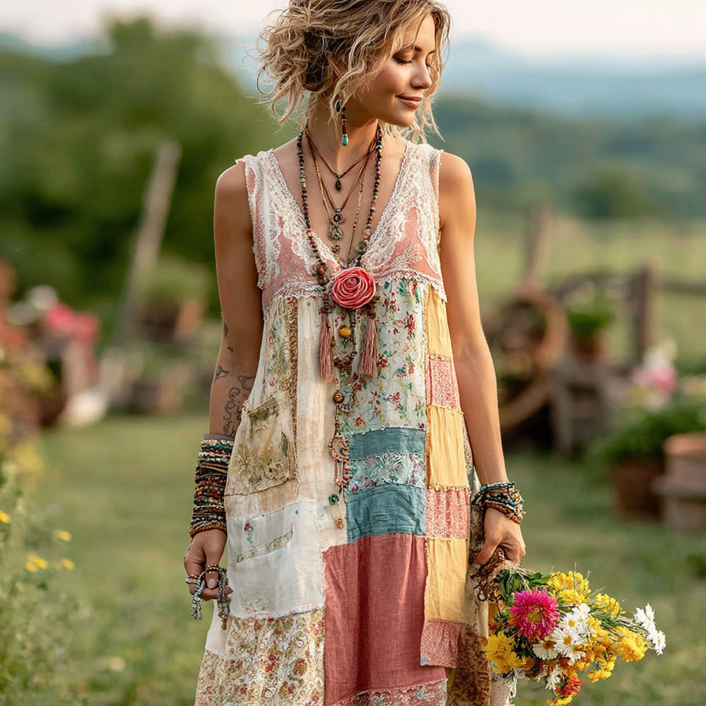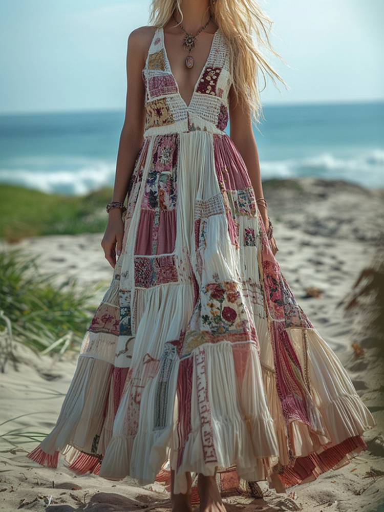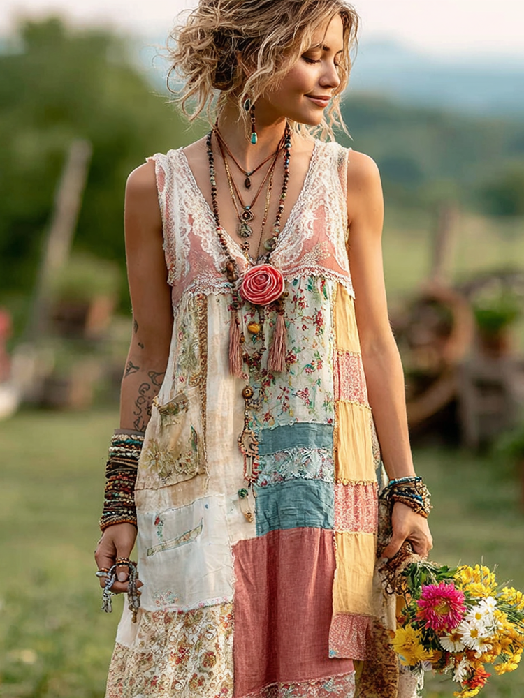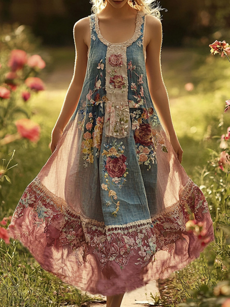 Women's Vintage Floral Patchwork Sleeveless Long Dress