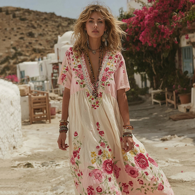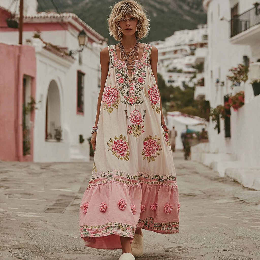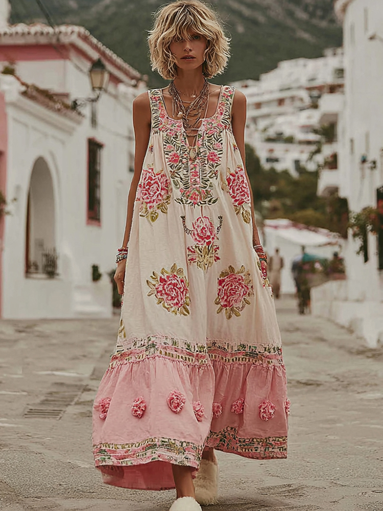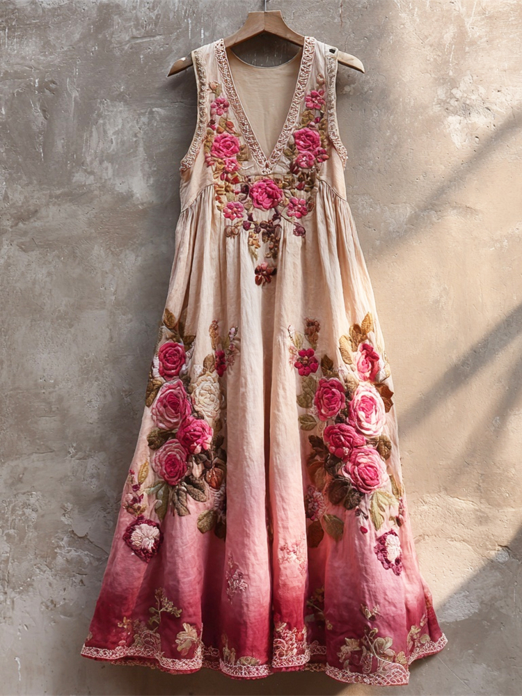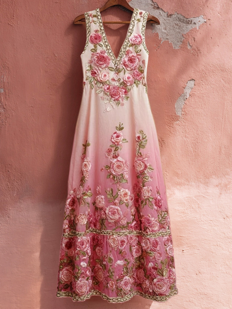 Boho Romantic Rose Embroidery Women's V-neck Vest Maxi Dress
