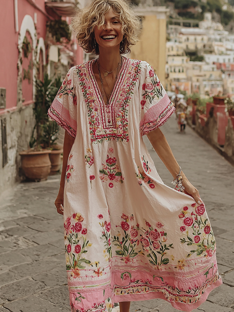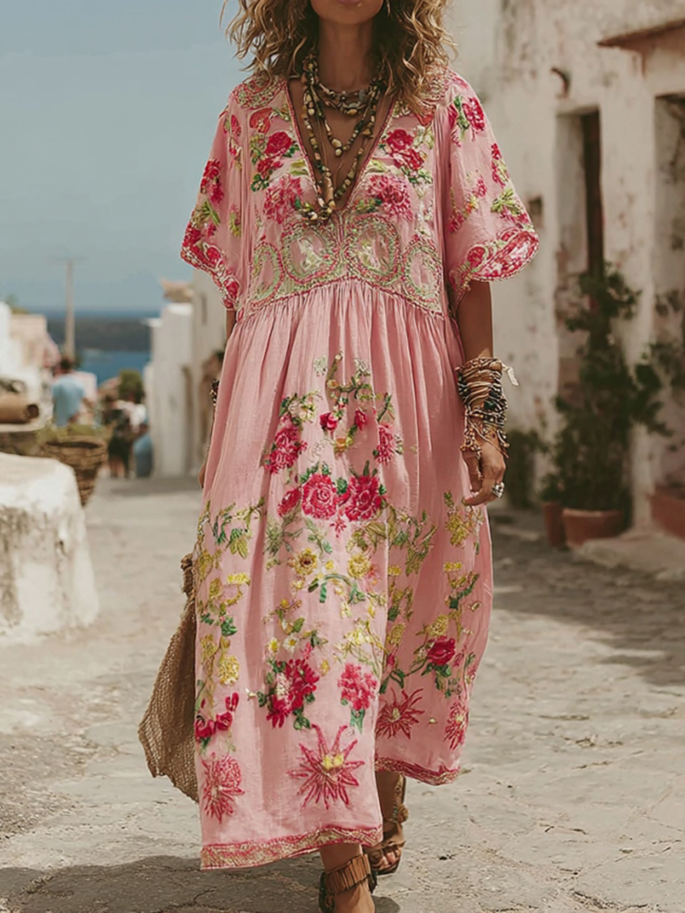 Women's Pink Rose Embroidery Bohemian V-neck Short Sleeve Linen Blend Midi Dress