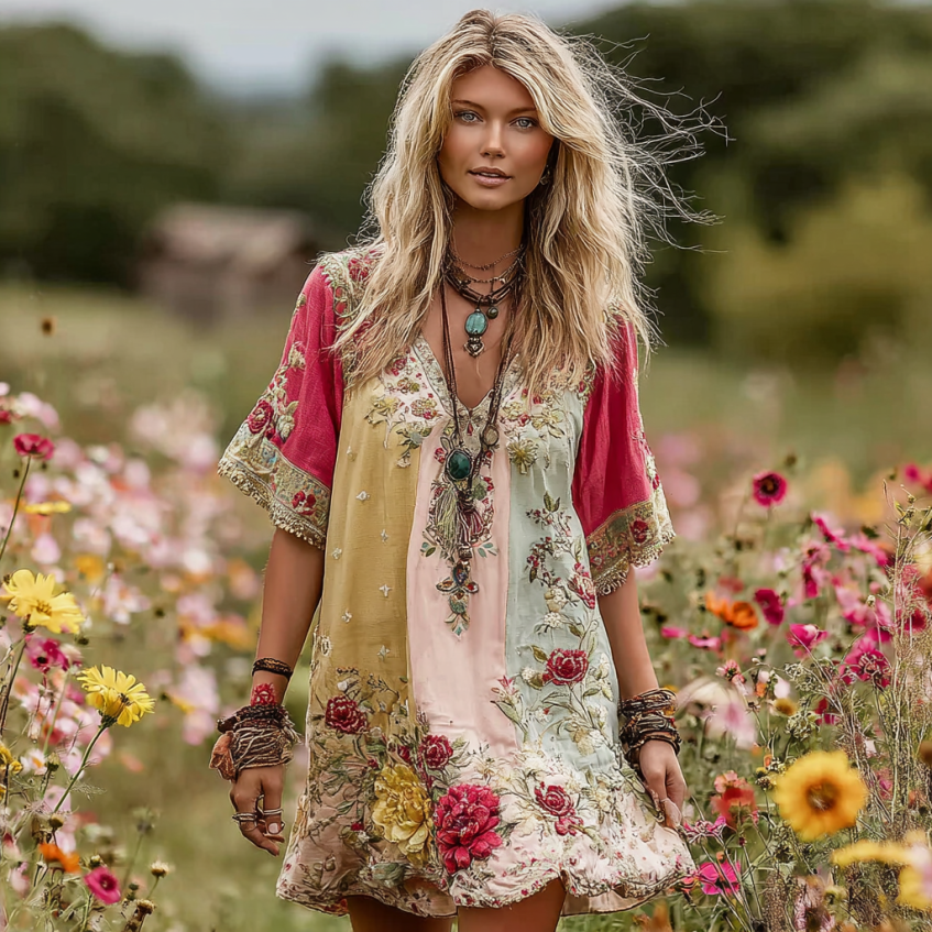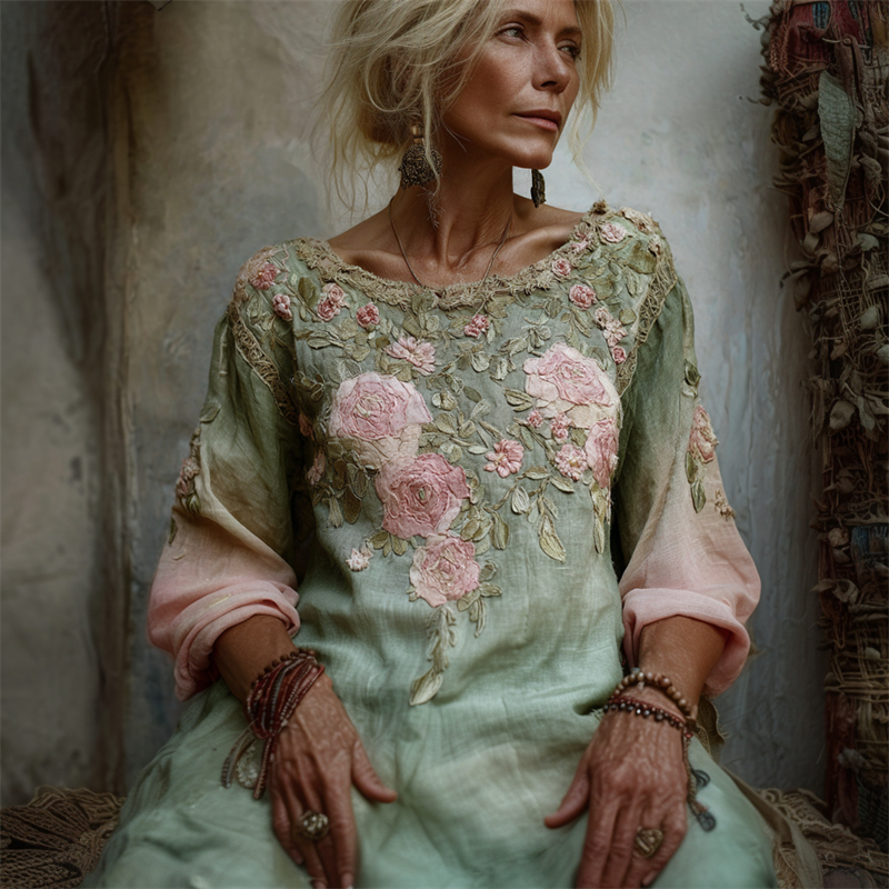 Women's Vintage Rose Floralembroidery Linen Mini Dress