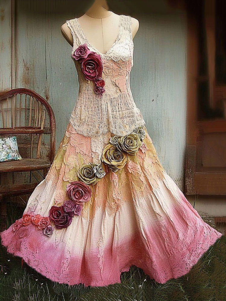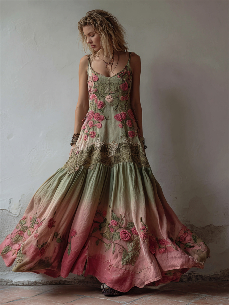 Vintage Forest Pink Roses Gradient Linen Maxi Dress