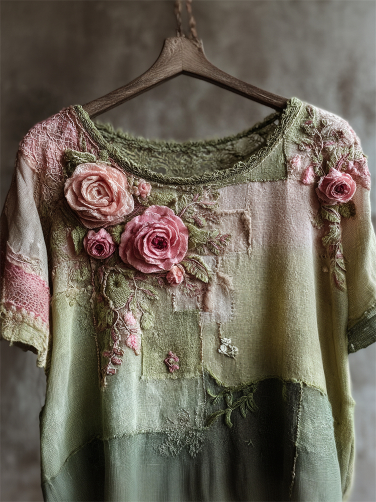 Women's Vintage Rose Gradient Art V Neck Linen Comfy T-shirt
