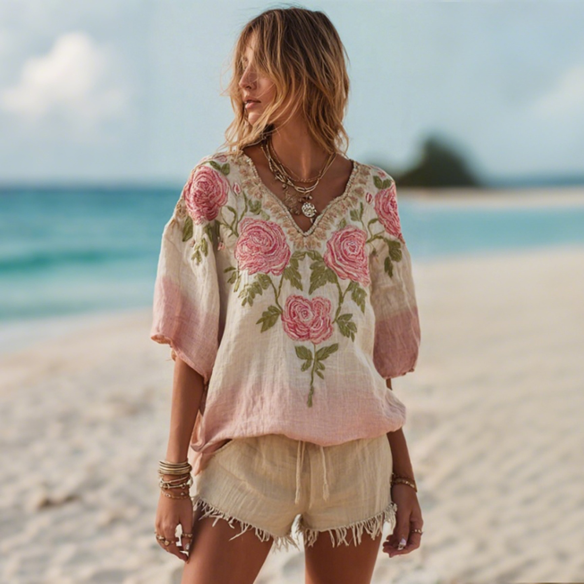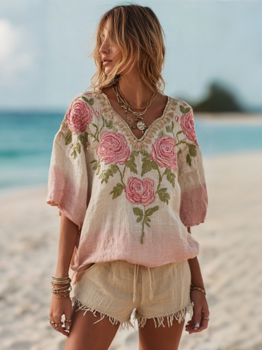 Women's Rose Floral Embroidery Art V Neck Comfy Shirt