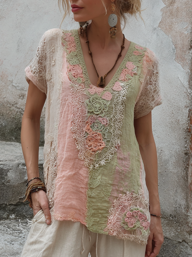 Women's Pink Floral Embroidery Art V Neck Linen Comfy T-shirt