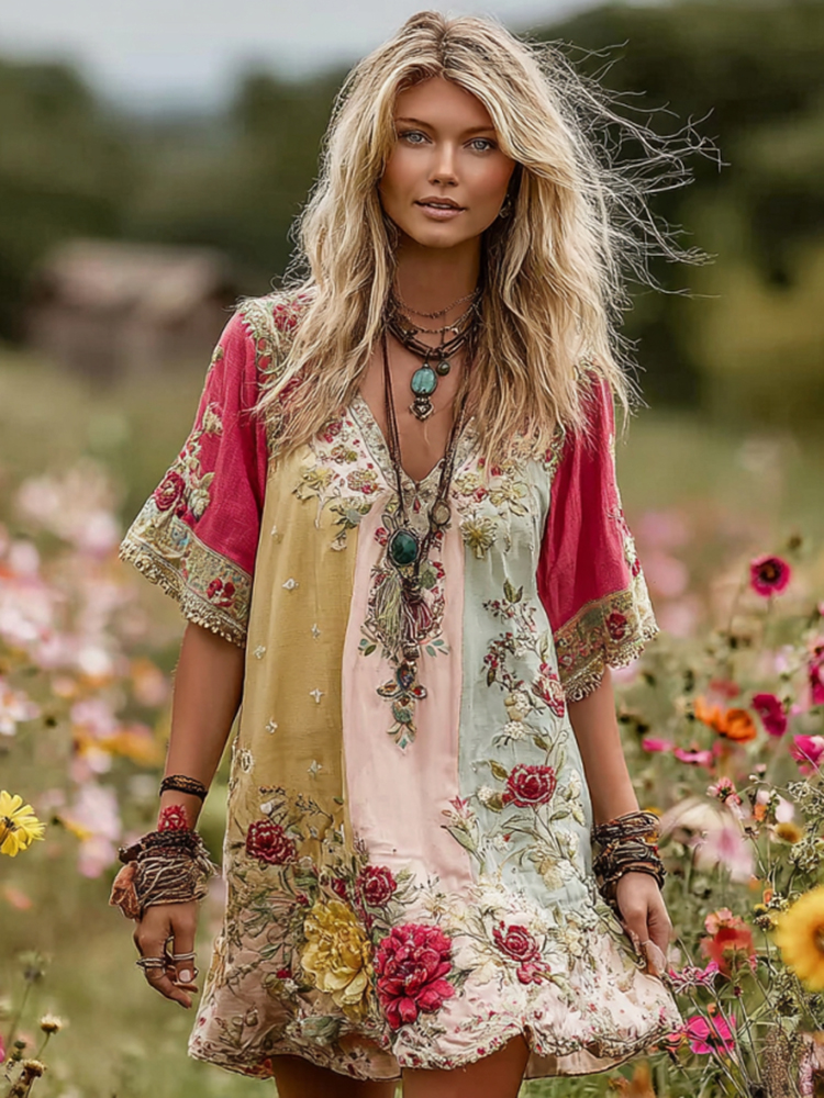 Women's Vintage Rose Floral Art Patchwork V Neck Midi Dress