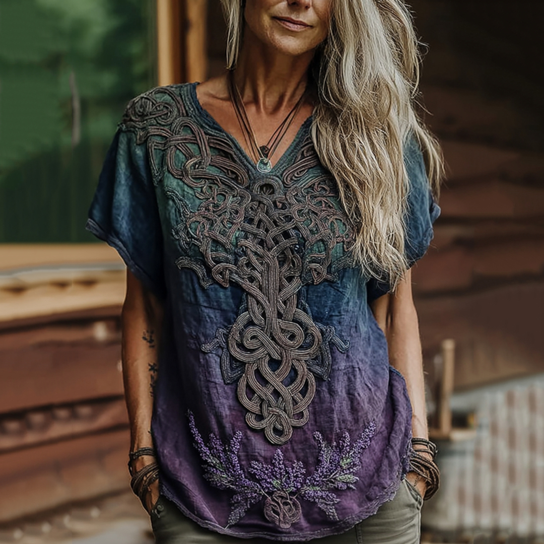 Women's Vintage Gradient Viking Celtic Knot Embroidered Art Cozy Linen Shirt