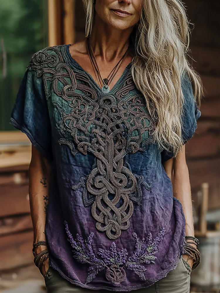 Vintage Viking Celtic Knot Gradient Embroidery Art Women's Linen T Shirt