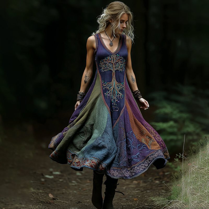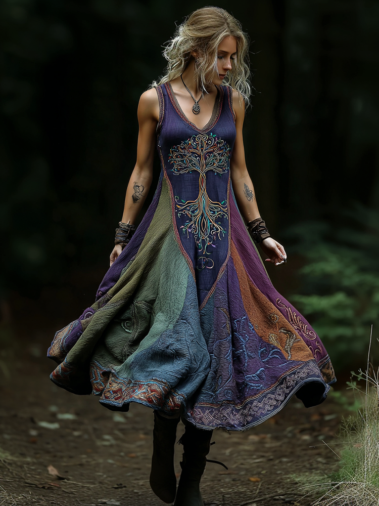 Vintage Viking Tree Of Life Embroidered Women's V-neck Vest Maxi Dress