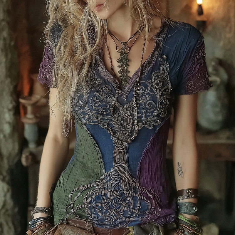 Vintage Viking Life Of Tree Embroidered Gradient Art Linen T-shirt