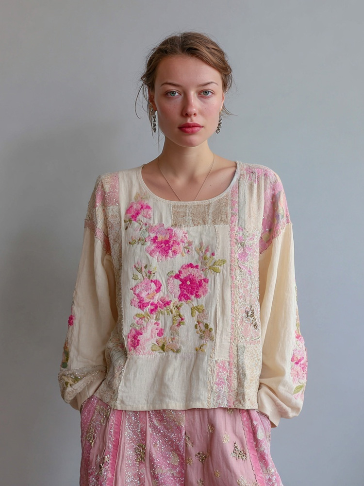 Boho Pink Floral Embroidered Patchwork Linen Shirt
