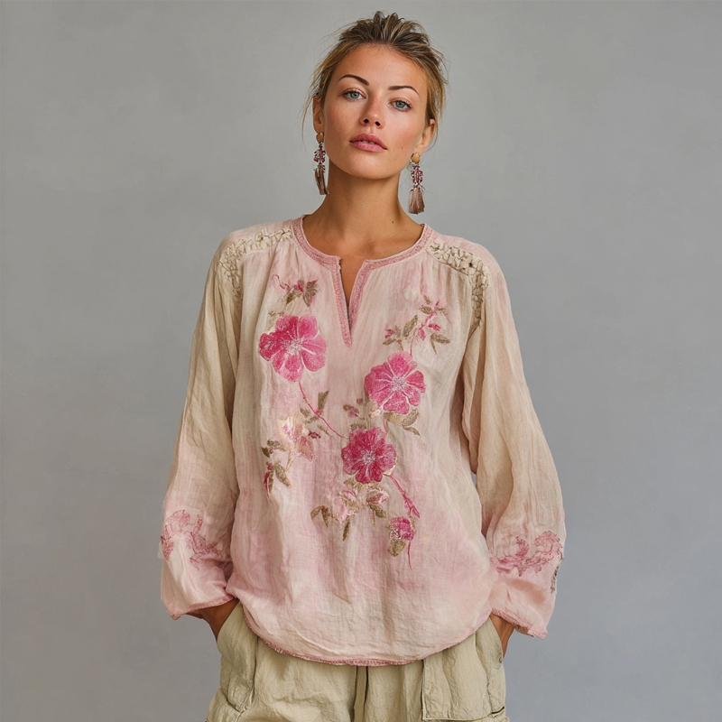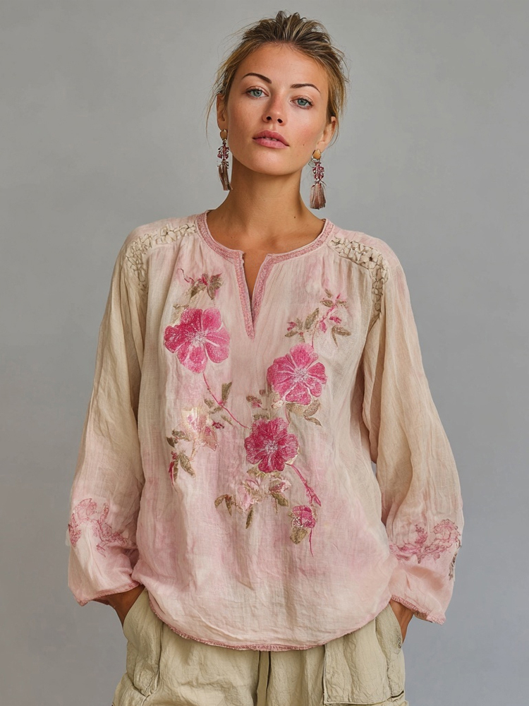 Boho Pink Floral Embroidered Vintage Linen Tunic