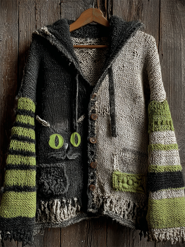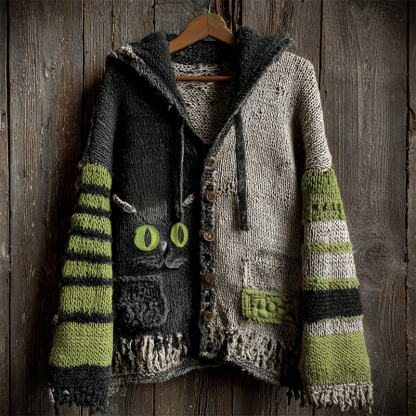 Halloween Black Cat Contrast Striped Hooded Cozy Knit Cardigan