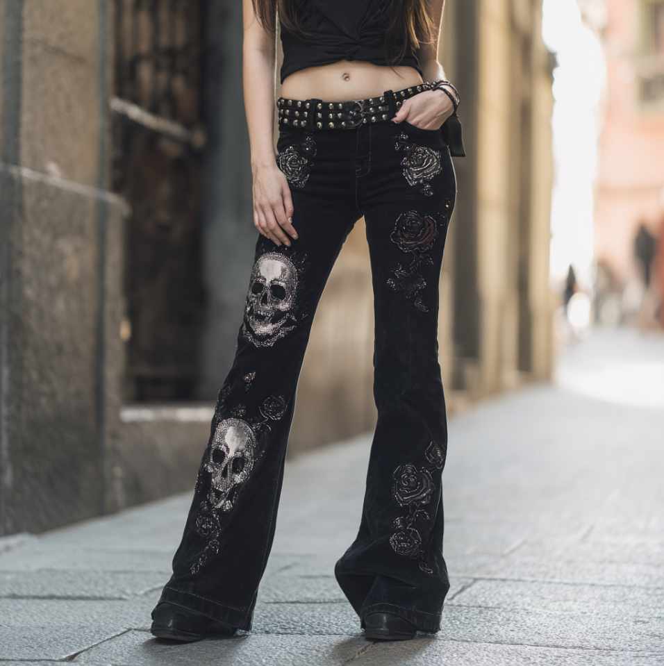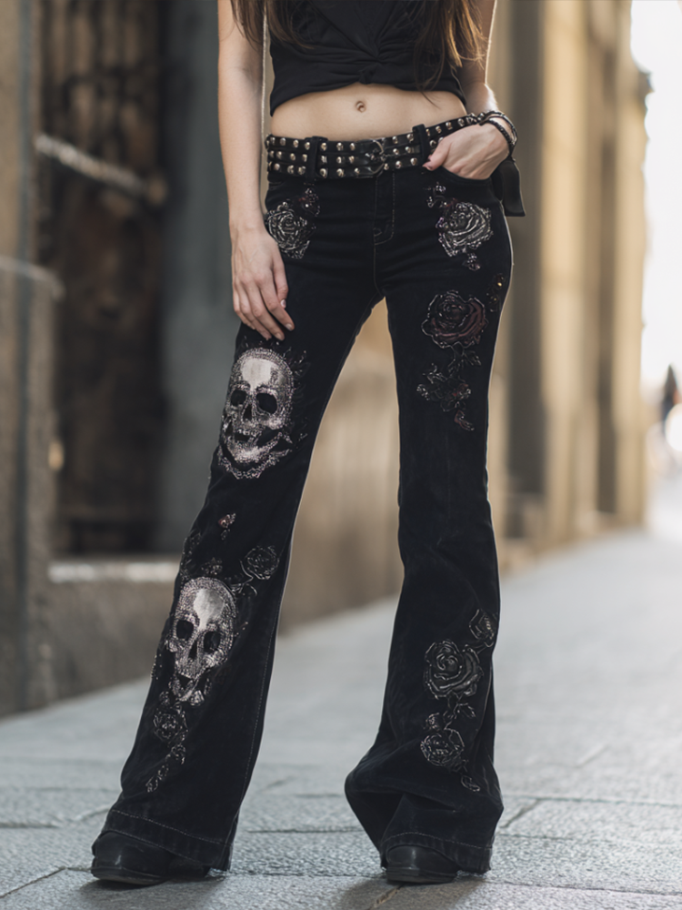 Halloween Gothic Dark Skeleton Series Women's Tight Jeans Bell-bottom Pants