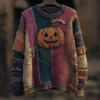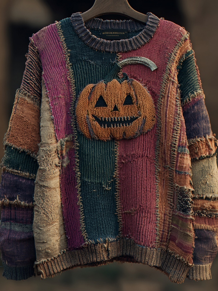 Halloween Pumpkin Face Embroidered Patchwork Knitted Sweater