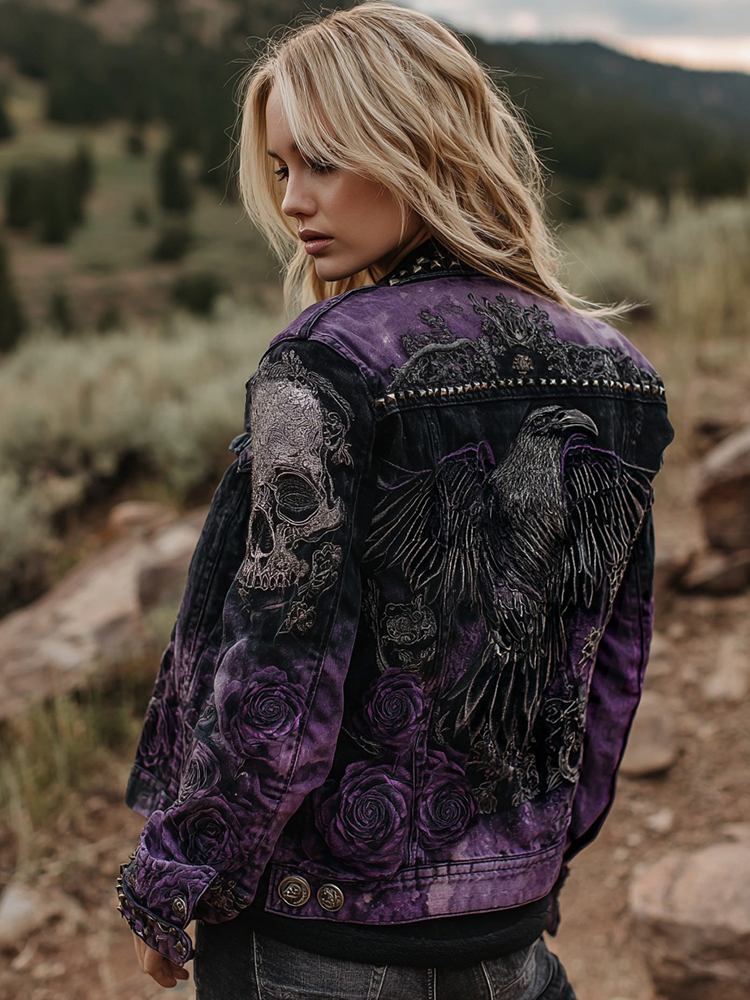 Halloween Raven Skull Rose Embroidery Beaded Washed Denim Jacket