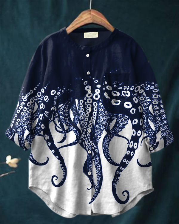 Octopus Print Stand Collar Long Sleeve Shirt