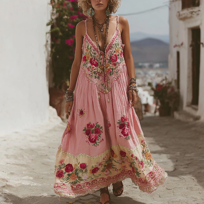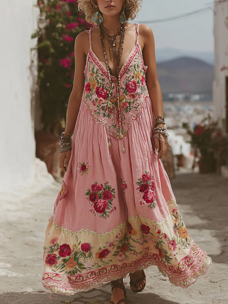 Pink Rose Embroidery V-neck Suspender Maxi Dress